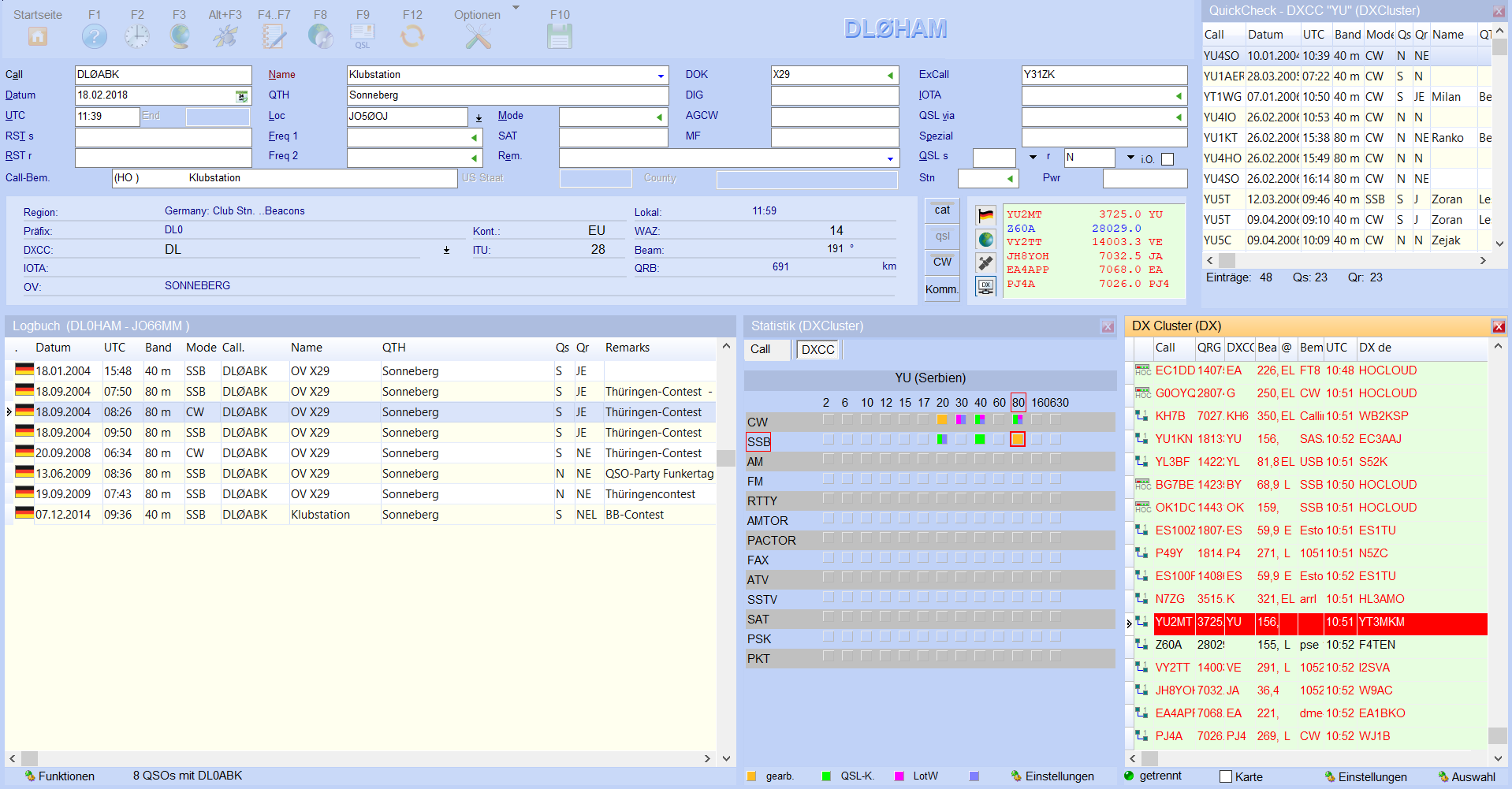 Bild oben:QSO-Eingabe: oben rechts: QuickCheck, unten Logbuch, Statistik und Rundenliste, in der Mitte DXCluster-Infofenster